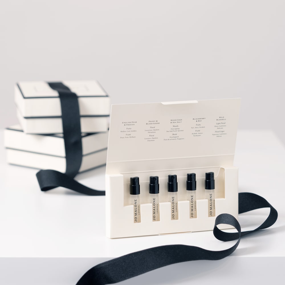 Contains mellow English Pear & Freesia, flirtatious Peony & Blush Suede, fresh Wood Sage & Sea Salt, juicy Blackberry & Bay and delicate Wild Bluebell. Each can be worn solo or layered with another as a Scent Pairing.